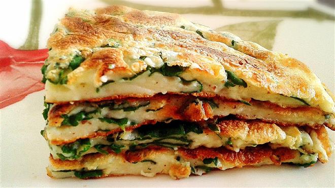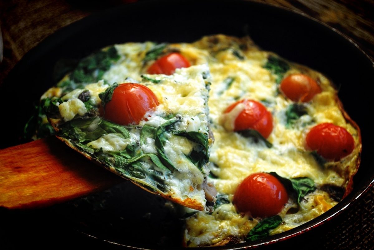 - Despeje os ovos batidos sobre o espinafre na frigideira.